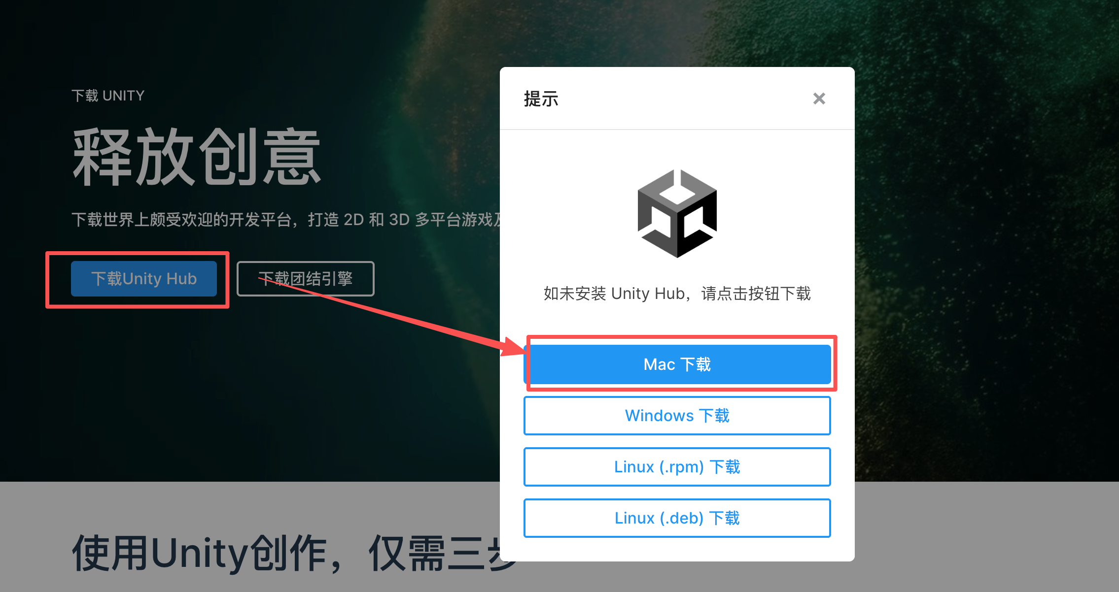 关于Unity的安装,我们可以直接在官网(https://unity.cn/)下载Unity Hub,然后使用Unity Hub安装对应版本的Unity版本即可,这一步与Windows系统的下载步骤一致。