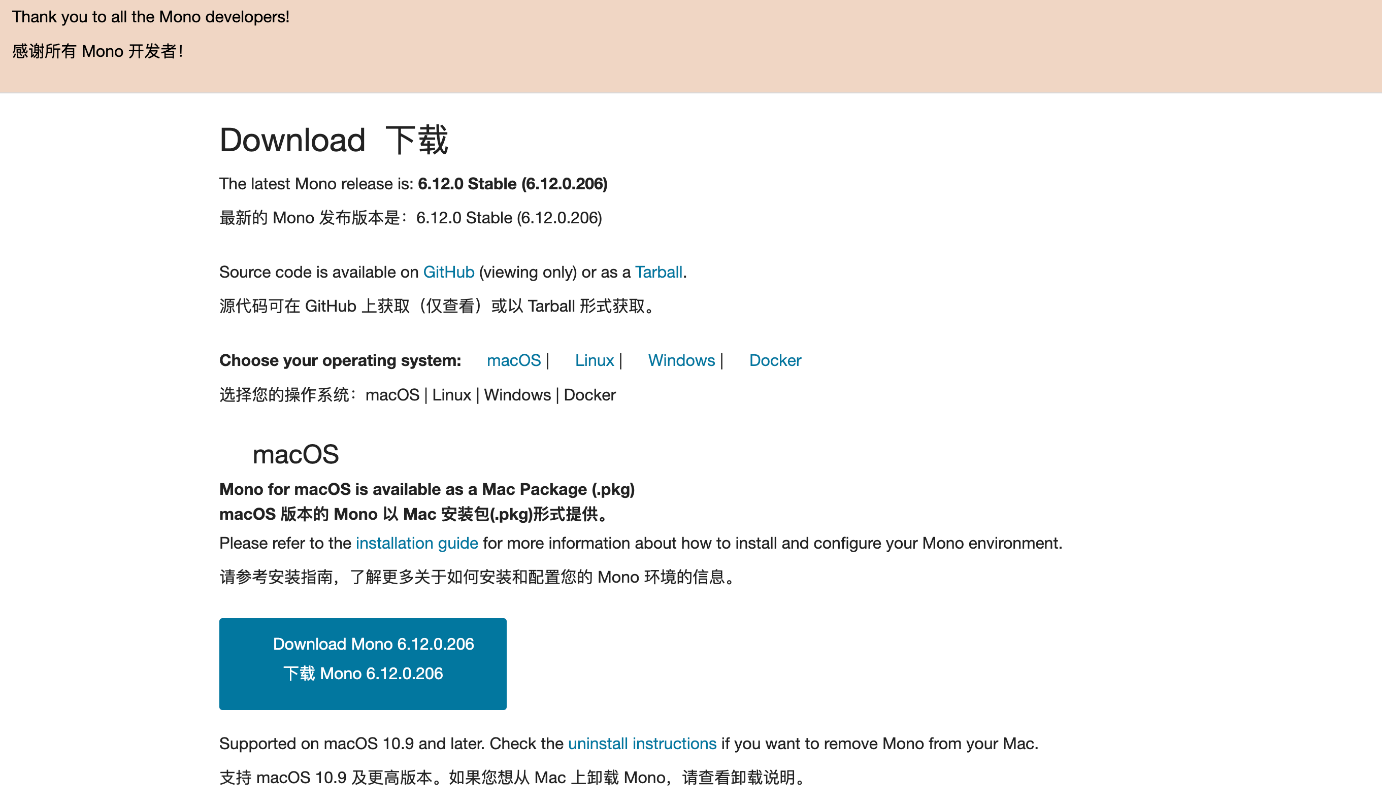 另外,如果我们需要代码自动补全,需要安装Mono,mono的下载链接:https://www.mono-project.com/download/stable/