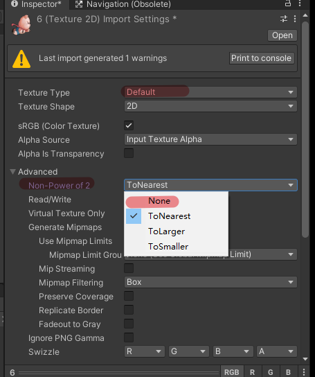 那你就先切回Default状态,然后把它Non-Power of 2这个枚举设置为None并应用