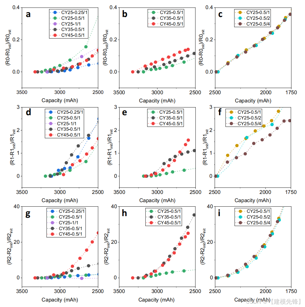 在此,通过拟合的电化学阻抗参数讨论了每个循环组的主要老化因素,如图5所示。原始数据和拟合数据之间的每个测量阻抗谱的决定系数(R2)汇总在补充表12中。所有R2值都大于0.999,表明拟合精度可靠。所有原始和拟合的阻抗数据都可以从数据可用性中找到。通过比较所有三种类型电池的初始值(Rinit)的电阻增量,R0的增量最小(图5a-c),其次是R1(图5d-f)。如图5G-I所示,R2在电池容量衰减过程中表现出最大的增长。在不同的工作条件下,主要的退化因素是不同的。对于NCA细胞,如图5A所示,Cy25-0.25/1显示R0稳定而相对较小的增加,但在图5D中其R1显示加速上升,表明SEI层厚度增加。图5G中的CY250.25/1的R2与其R0呈现类似的增加趋势。图5A中的Cy25-0.5/1和Cy25-1/1的R0始终是最大的电阻贡献,但它们的R1和R2相对较低,这表明锂电镀47,49可能导致更严重的电池退化,如电解液干涸或接触损失。对于图5B,e,h中的NCM电池的结果,Cy25-0.5/1的所有电阻都缓慢增加,而在35℃和45℃循环的电池的电阻表现出较大的增加率。对于NCA+NCM电池,通过比较图5C,f,I中的结果,放电速率的影响主要由R1表示。图5F中的CY25-0.5/4 SEI电阻的增加明显慢于其他循环条件。温度对降解机理的影响可以在图5G,h中看到,其中R2的增加主要与环境温度的升高有关。在45℃和35℃下循环的电池主要导致R2的增加,这可能与正极活性物质的损失有关,例如颗粒破裂和粉碎50,51。电池内部退化机制的多样性导致了各种退化路径,这可以解释将简单的线性模型应用于电池容量估计。此外,不同类型的电池似乎在某种程度上遵循相似的退化规律,例如R2的指数上升,这启发了后面部分的迁移学习的使用。