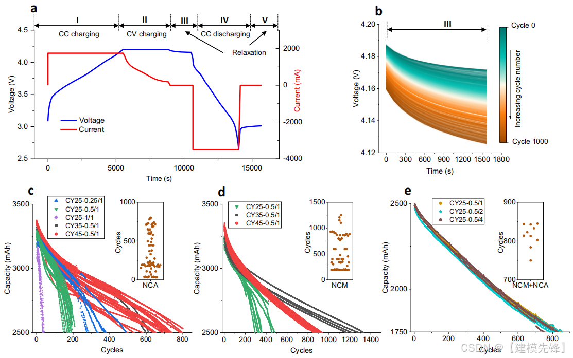 电压和电流是这些实验中记录的基本数据,包括充电、放电和松弛过程。电池循环是通过恒流(CC)充电到4.2V,电流速率从0.25C(0.875 A)到1C(3.5A),然后是4.2V的恒压(CV)充电步骤,直到达到0.05C的电流。然后使用恒流分别将NCA电池和NCM+NCA电池分别放电到2.65V和2.5V。使用0.5C充电率的NCA电池的一条完整的循环曲线如图1A所示,它包括五个过程,即(I)CC充电,(II)CV充电,(III)充电后的松弛,(IV)CC放电,和(V)放电后的松弛。CC放电容量视为电池在循环过程中的剩余容量。当实际采样时间为120时,NCA电池和NCM电池的循环充电到CC放电的松弛时间为30min,而当采样时间为30 S时,NCM+NCA电池的松弛时间为60min。电池松弛期间的起止电压随循环次数的增加而呈下降趋势,如图1B所示。