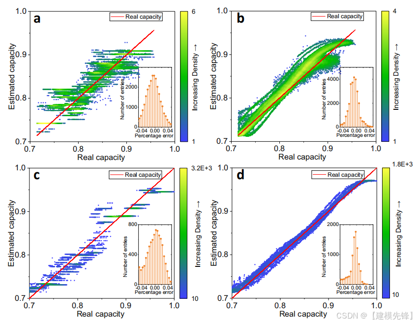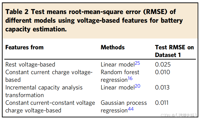 如表2所示,使用用于电池容量估计的电压曲线的最新模型对所提出的方法的性能进行了基准测试。从所提出的容量估计方法的每一类中选择一种具有代表性的方法(补充表1)。由于文献中使用的数据集在电池材料和测试程序上与我们的不同,解决这种差异的策略是将他们的算法应用到我们的数据集。补充说明3和补充图4-7详细描述了每种方法的数据处理和估计结果。巴格达迪等人25中基于静止电压估计电池容量的线性模型的性能显示了2.5%的RMSE,这可以用我们的数据集中的大量数据和各种工作条件来解释,1突出了仅使用线性模型估计容量的难度。在基于CC充电电压的方法中,使用3.6V到3.8V的电压范围的随机森林回归(RFR)方法16在数据集1上获得了1.0%的RMSE,比我们基于电压松弛的RMSE低0.1%。Peri等人提出了一种基于剩余电荷的方法,该方法具有根据增量电容值的阈值。在数据集1上应用相同的增量容量转换方法,RMSE为1.3%,表明我们提出的方法具有更好的精度。使用全CC-CV充电电压曲线的高斯过程回归(GPR)方法44在数据集1上获得了良好的估计结果,测试RMSE为1.1%。与目前的研究现状相比,尤其是在大数据集的情况下,本文提出的基于静止电压的估计方法可以达到较好的估计精度。正如导言部分所提到的,在获取特定的充电电压曲线方面存在一些挑战,因为电池充电的开始通常取决于驾驶员的行为,而且在电动汽车的实际应用中,充电模式与充电站有很大不同。在不需要特定的工作条件和电压范围的情况下,很容易得到电池充满电的松弛过程,这为电池容量的估计提供了一个新的视角。