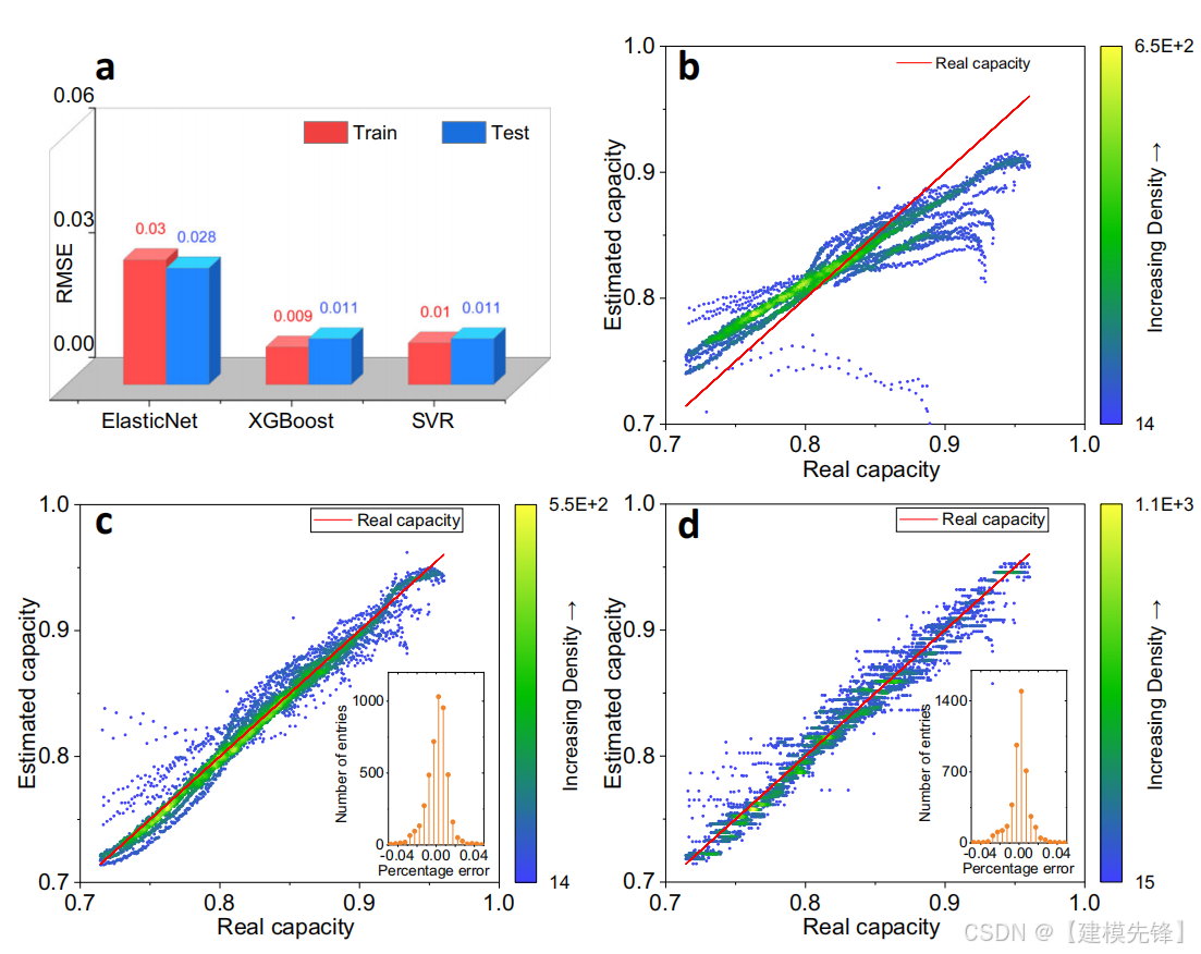 结果表明,均方根误差随着特征个数的增加而逐渐减小,在使用图3中的三个特征后,精度提高不再明显。输入[Var,Ske,Max]三个特征组合的估计结果最佳。松弛时间对容量估计的影响如补充图3所示,在XGBoost方法中,训练和测试的均方根随着松弛时间的增加而减小,表明较长的松弛时间提高了模型的精度。因此,提取30分钟后的电压松弛的Var、Ske和Max作为基本模型的输入。补充表11提供了每种算法的超参数。图4A总结了不同估计方法在数据集1上的均方根误差。结果表明,XGBoost和SVR的测试均方根误差均达到1.1%,表现出比线性模型更好的性能,而训练和测试的均方根误差接近,说明了数据拆分的有效性。为了直观起见,图4B-D中说明了估计容量与实际容量之间的关系。