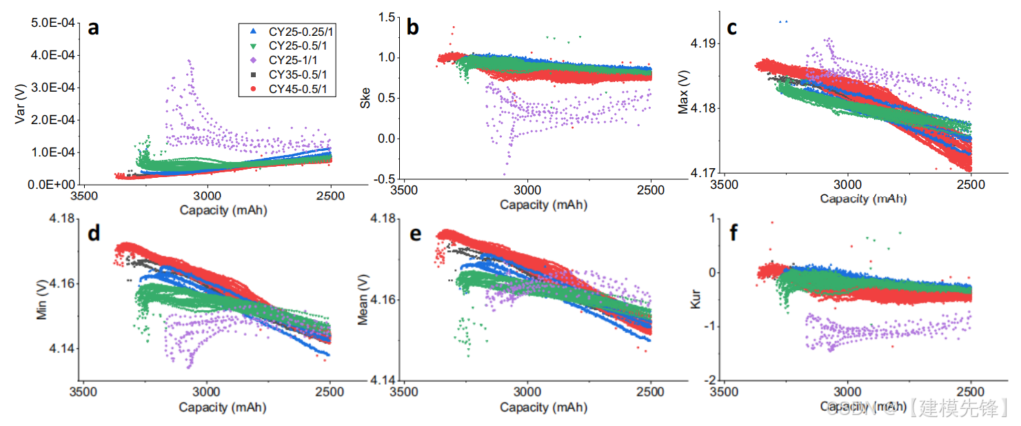 电池容量和相应特性之间的关系取决于图2所示的循环条件。由此可见,仅用线性函数来描述这种关系是困难的。图2a中的Var代表了一个驰豫过程中电压点的分布,Var随容量衰减的减小意味着驰豫电压随容量的增加而呈现出更尖锐的分布循环编号,反之亦然。Ske和Kur都使用Var进行归一化,它们被用来描述相应的电压曲线的形状。图2B中的Ske在几乎所有循环条件下都是正的,表明超过一半的采样电压数据低于平均电压(平均值),平均电压对应于松弛电压曲线的形状,即相对于松弛时间,电压最初快速下降,然后逐渐减慢。图2C中的最大值显示了所有循环条件下最大电压与容量降之间的单调下降。如图2D所示,与容量减少相比,最小值和平均值分别先增加后减少。图2F中所示的Kur为超额用原始数据的峰度减去正态分布的峰度得到的峰度。在所有循环条件下,过量峰度都是负的,这意味着弛豫电压的分布比正态分布更温和。