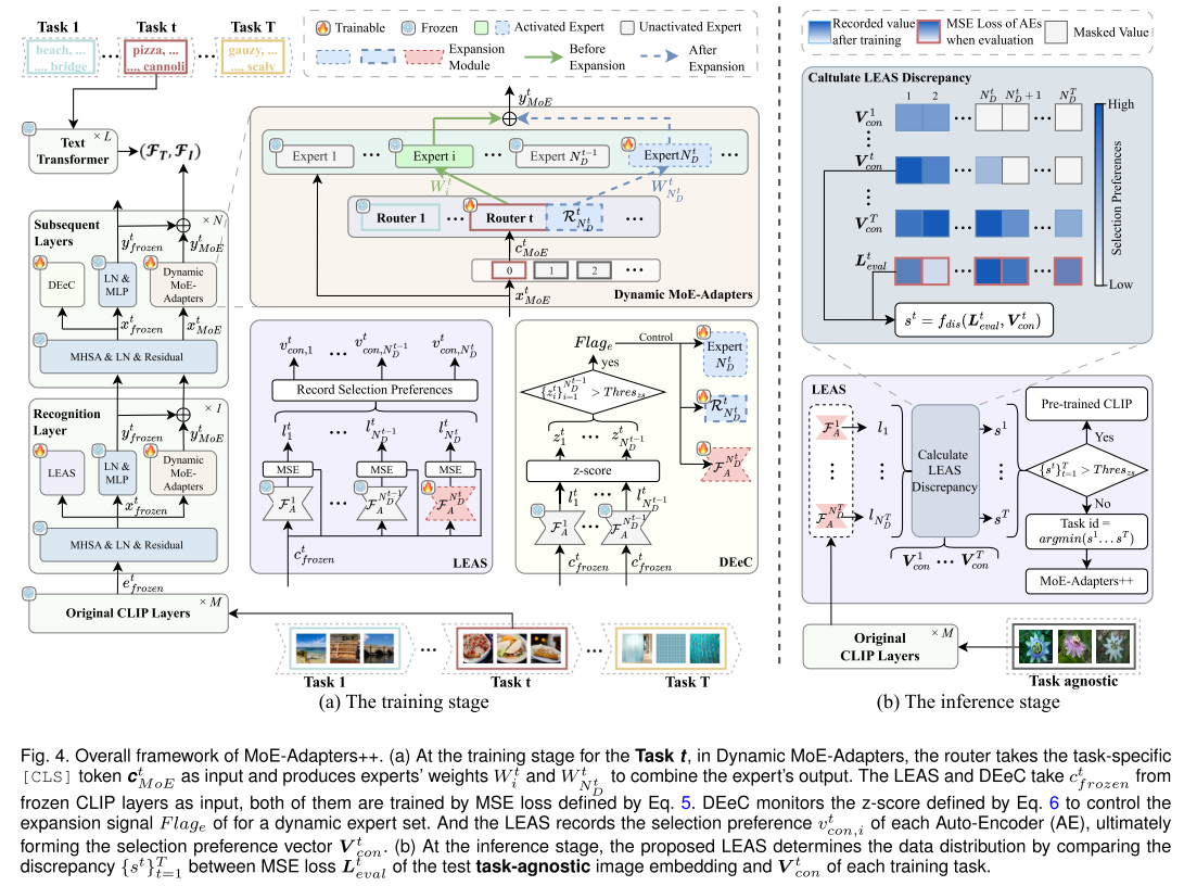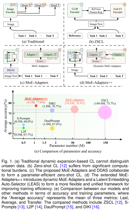 本文将深入解读来自大连理工大学等机构的研究团队发表在TPAMI 2025上的工作:MoE-Adapters++。该方法巧妙地结合了混合专家(Mixture-of-Experts)机制与参数高效微调技术,在保持模型零样本能力的同时,实现了高效的持续学习。