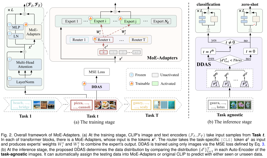摘要:在本文中,我们首先提出了MoE-Adapters,这是一种参数有效的训练框架,用于缓解视觉语言模型(VLM)增量学习中的长期遗忘问题。我们的移动适配器利用增量添加的路由器来激活和集成来自预定义静态专家集的独家专家适配器,使预训练的CLIP能够有效地适应新任务。为了保持VLM的零样本学习能力,引入了分布判别自动选择器(DDAS),将分布内和分布外输入分别自动路由到moe - adapter和原始CLIP。然而,依赖静态专家集和单独的分布选择器会导致参数冗余和增加训练复杂性。作为回应,我们进一步扩展了MoE-Adapters++框架,引入了动态MoE-Adapters,使专家能够在持续学习过程中自适应地参与进来。此外,提出了一种潜在嵌入自动选择器(LEAS),将分布选择集成到CLIP中,以创建更统一的体系结构。在不同环境下进行的大量实验表明,所提出的方法在提高训练效率的同时,始终优于以前最先进的方法。