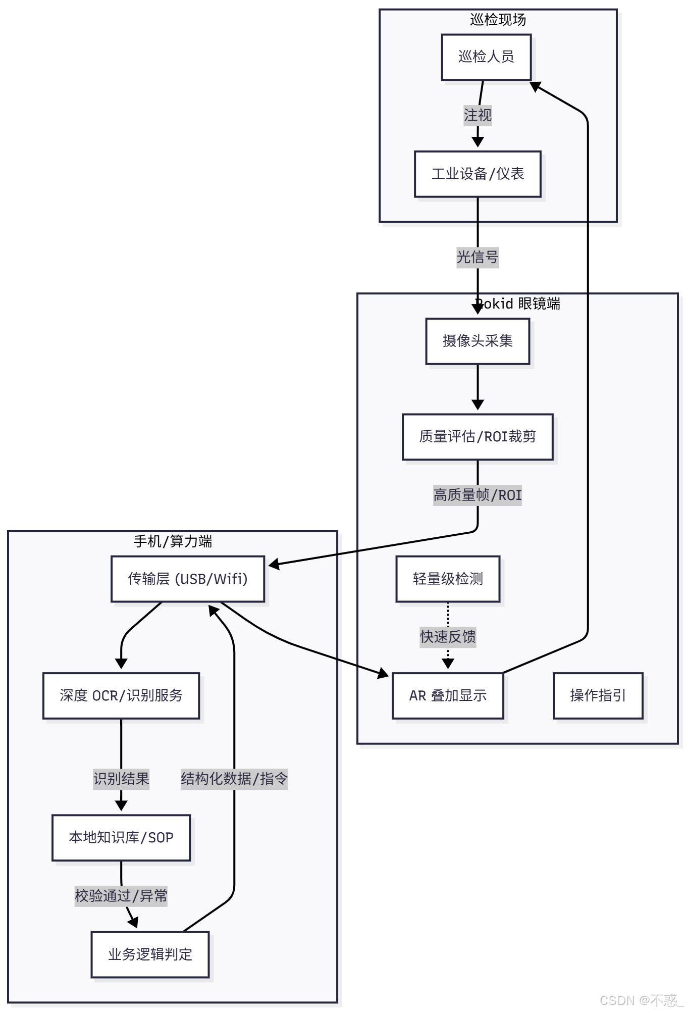 - 手机协同端(算力端):接收眼镜上行的关键帧,运行高精度的 OCR 版面分析、深度学习推理与知识库比对,最终返回结构化数据与操作指令。