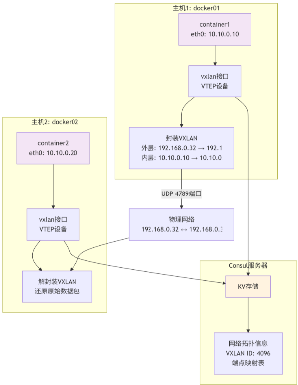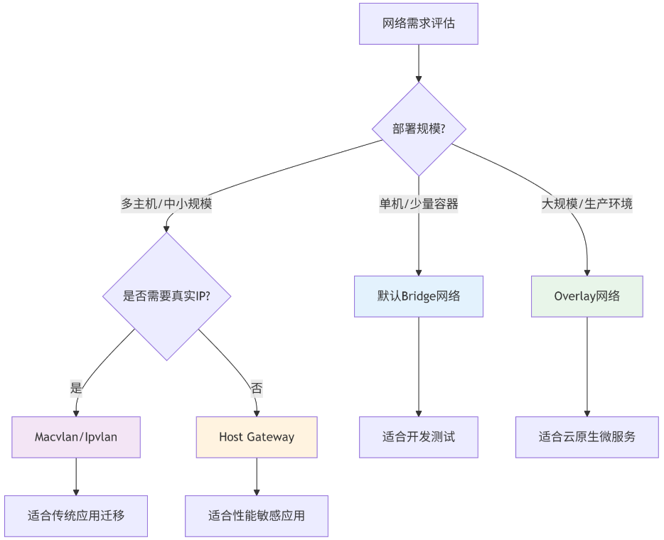 | Overlay | VXLAN隧道封装 | 1. 支持大规模部署 2. IP重叠没问题 3. 自动服务发现 | 1. 需要外部KV存储 2. 有封装开销 3. 配置较复杂 | 生产环境,多云/多数据中心 |