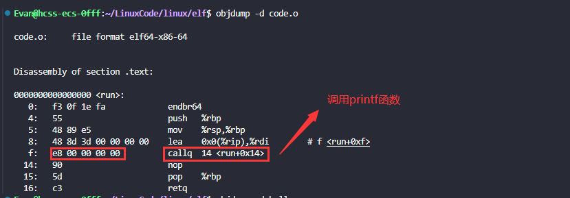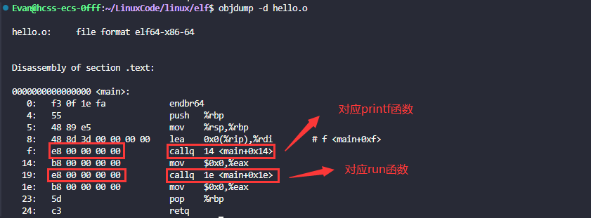 可以发现这里的call指令,对应着printf和run函数,由于编译hello.c时,编译器不知道printf和run函数的存在,因此编译器将这两个函数的跳转地址暂时设置为0,这个地址在链接的时候就会被修正,链接时链接器会根据数据块(.data)的重定位表进行修正。