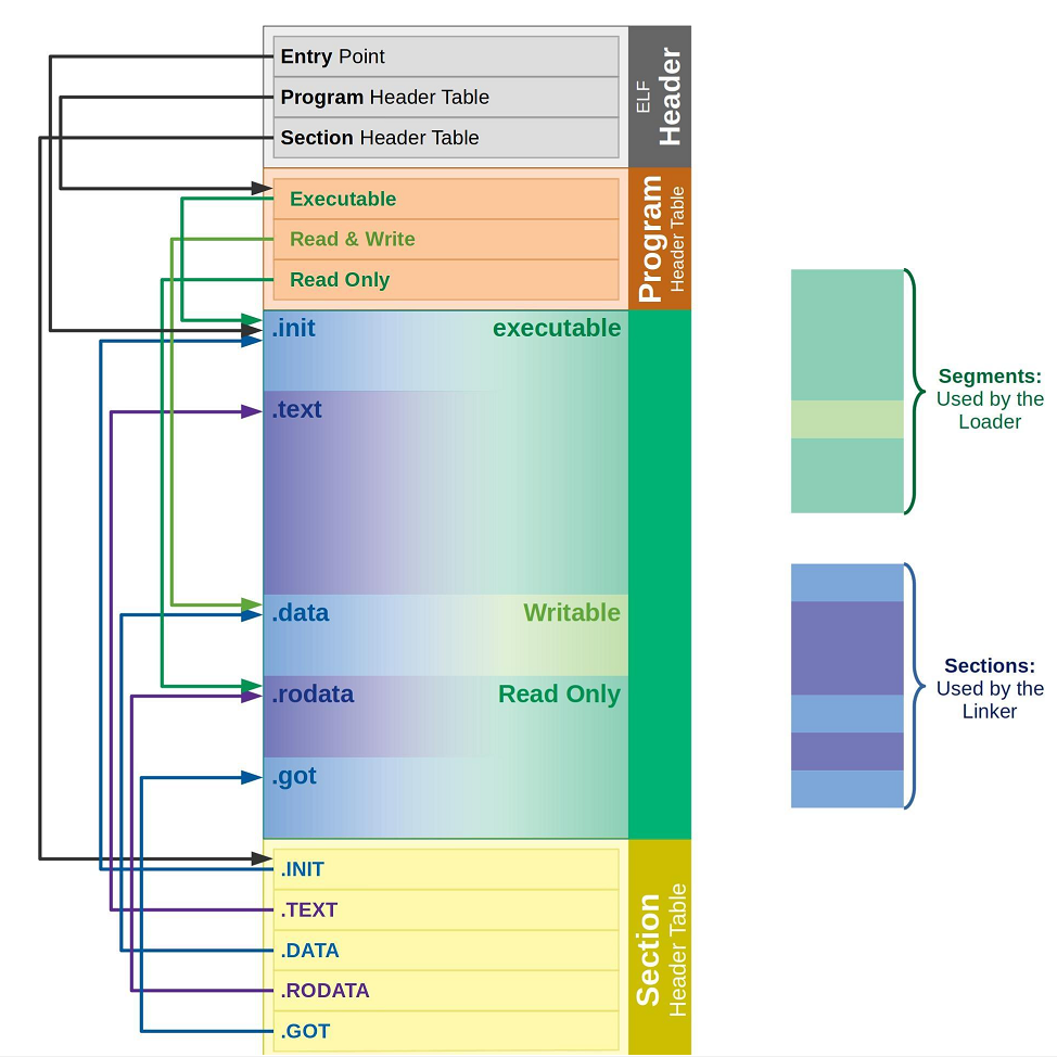 - 程序头表 (Program header table) :列举了所有有效的段(segments)和他们的属性。表里记着每个段的开始的位置和位移(offset)、长度,毕竟这些段,都是紧密的放在⼆进制文件中, 需要段表的描述信息,才能把他们每个段分割开。