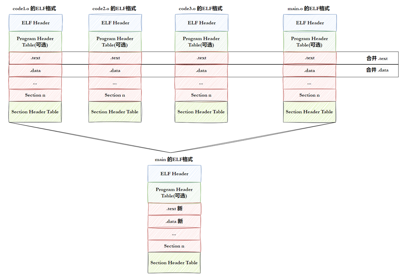 Section header table- 为了空间布局上的效率,将来在链接目标文件时,链接器会把很多节(section)合并,规整成可执行的段(segment)、可读写的段、只读段等。