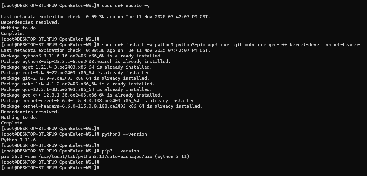 - ✅ 系统基础:openEuler 24.03 LTS 系统识别正常,内核版本 6.6.87.2-microsoft-standard-WSL2