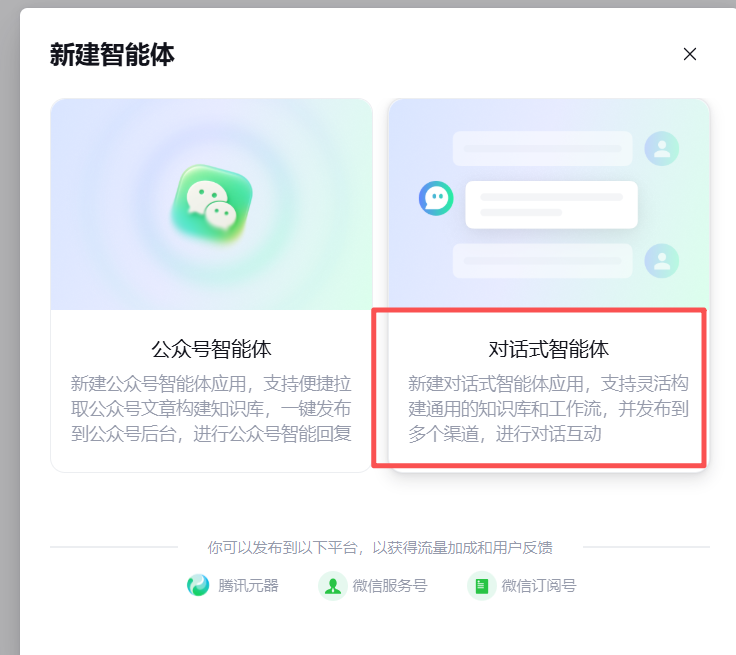 如上图所示,系统提供了多种智能体类型供选择。此处选择"对话式智能体"最为恰当。对话式智能体专注于自然语言的交互,能够更好地承载复杂的逻辑推理任务和角色扮演需求,这正是"海龟汤"游戏的核心------通过不断的对话来缩小真相的范围。
