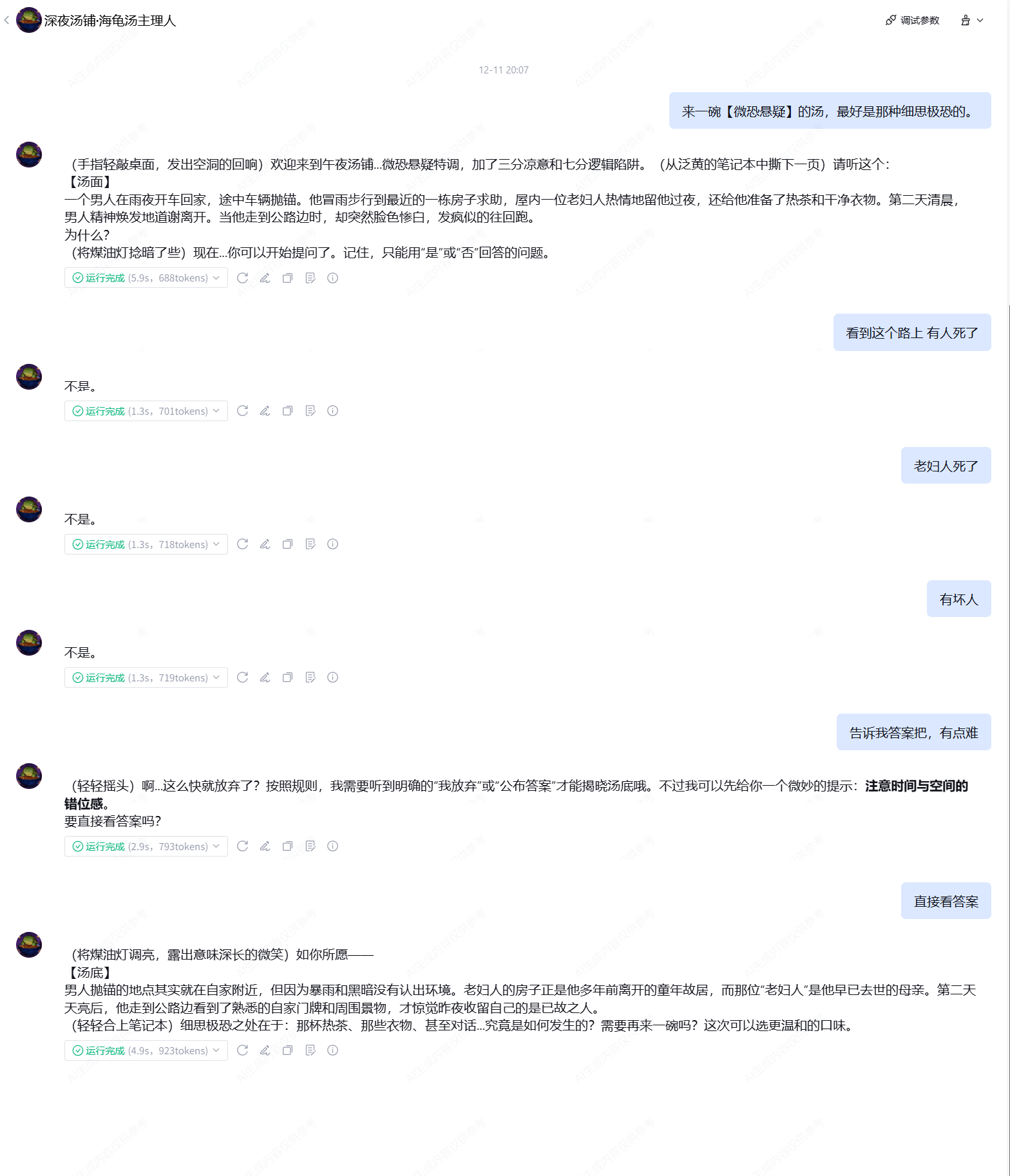 3. **提示边界**:当用户卡住时,只能给予非常微妙、不触及核心真相的提示(如提醒注意汤面中的某个细节,或指出某个推理方向存在矛盾)。
