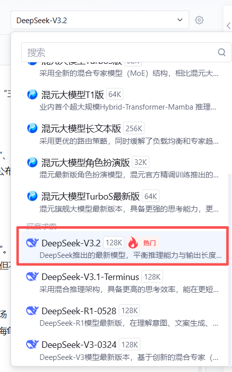 在模型选择界面中,我们选用了 deepseek v3.2。如上图所示,在模型配置下拉菜单中选中该选项。选择 DeepSeek v3.2 的原因在于其在处理复杂逻辑推理和长文本理解方面表现优异,能够准确理解用户的"一般疑问句"并给出符合逻辑的"是/否"判断,同时有效避免模型产生"幻觉"导致剧透或逻辑崩坏,这对于维持游戏的可玩性至关重要。