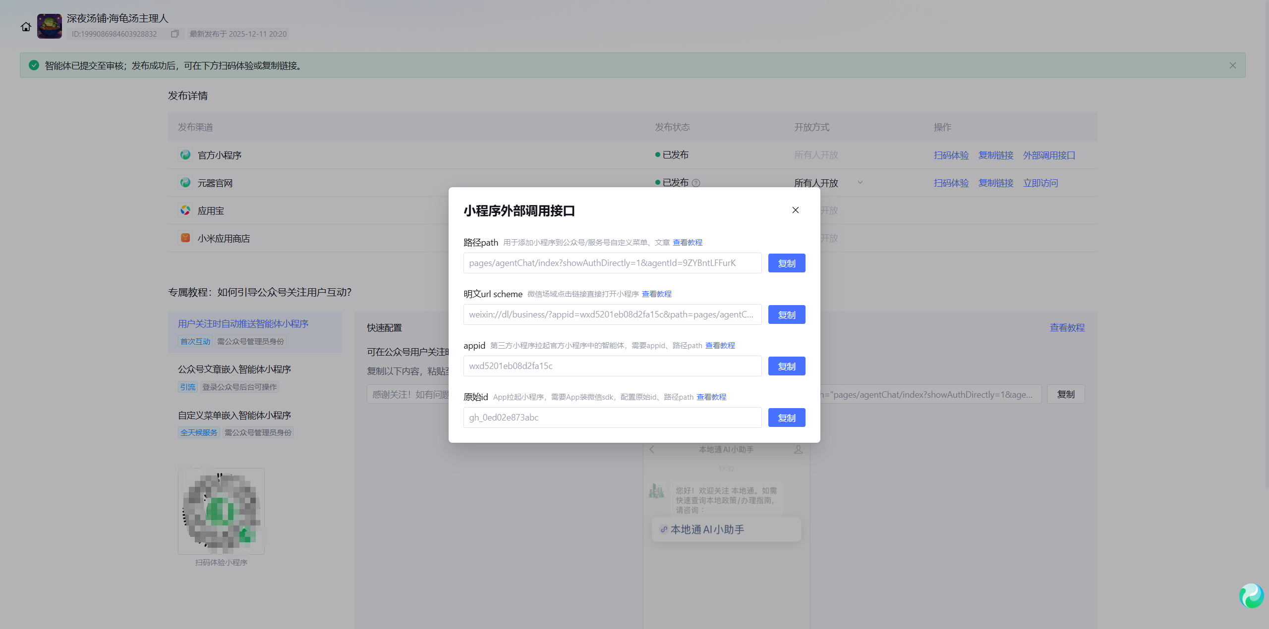 上图展示了发布成功后的界面。特别值得注意的是界面下方的"小程序外部调用"功能。这意味着开发者不仅可以在网页端使用该智能体,还可以将其集成到微信小程序中,极大地扩展了用户触达范围。