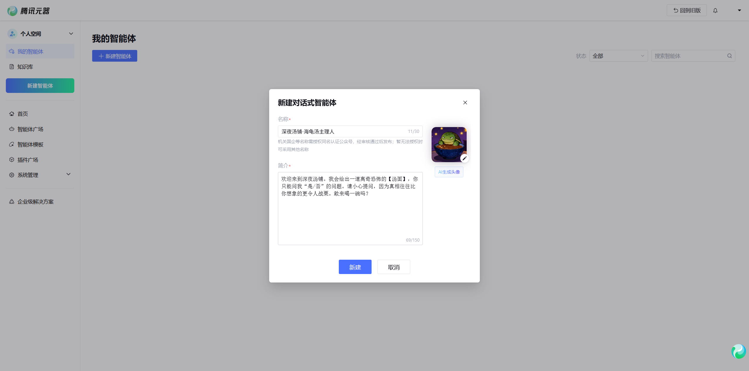 上图呈现了智能体配置界面的概览。在界面左侧,开发者可以上传智能体的头像,并填写名称与简介。这里将名称设定为具有辨识度的"海龟汤主理人"。右侧区域则是预览区,能够实时反馈配置的视觉效果。此时,一个初步的智能体框架已经搭建完毕。