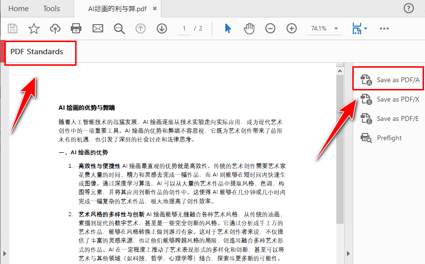 - 选择保存为 PDF/A :在右侧显示的操作面板中,选择另存为 PDF/A。