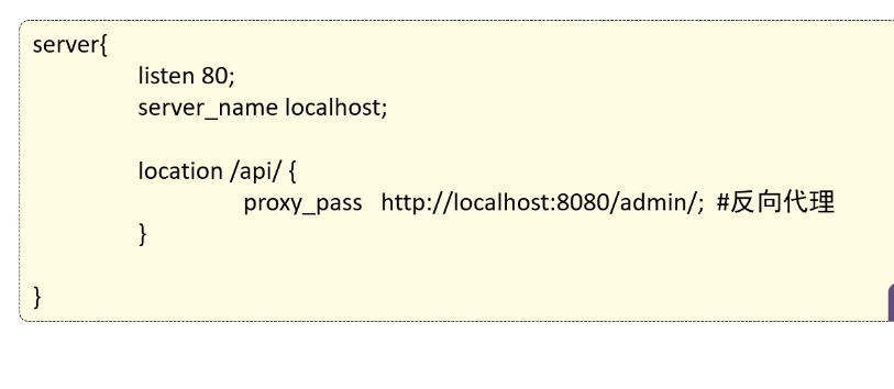 server表示虚拟机 ,监听端口 80 下面那个只要请求含有/api/ nginx就会进行反向代理
