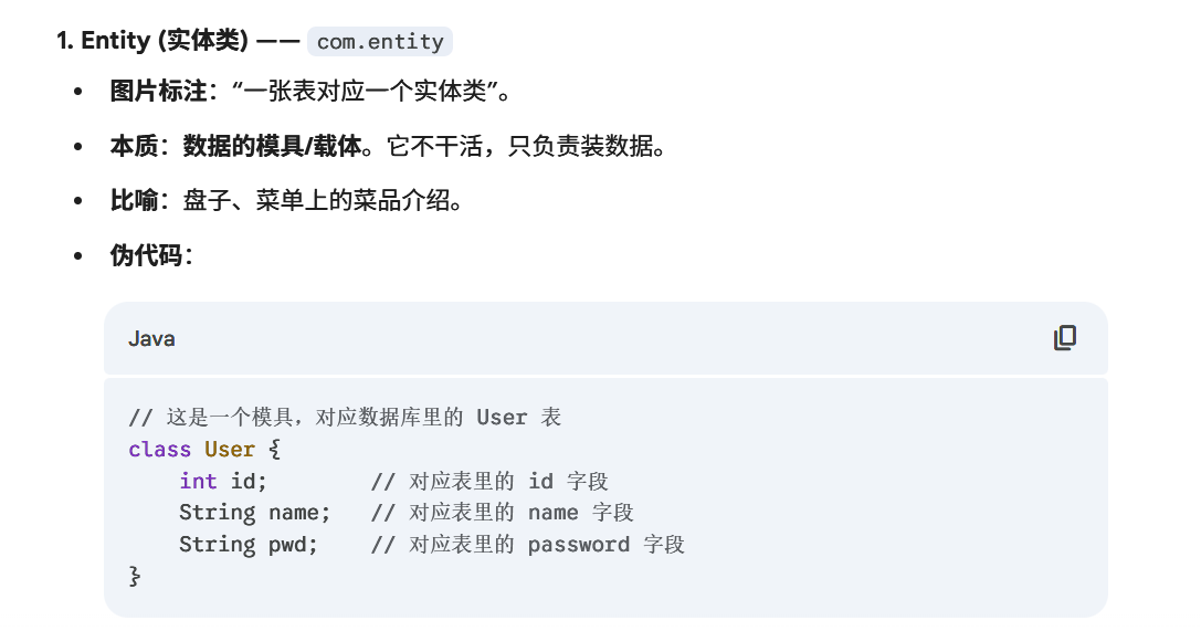 java// 这是一个模具,对应数据库里的 User 表 class User { int id; // 对应表里的 id 字段 String name; // 对应表里的 name 字段 String pwd; // 对应表里的 password 字段 }