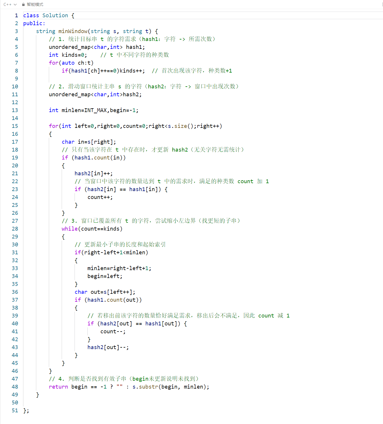 count == kinds时,说明当前窗口已包含t的所有字符,此时尝试缩小左边界以找到更短的子串; - 每次左移前,先检查当前窗口长度是否为「最小」,若是则更新