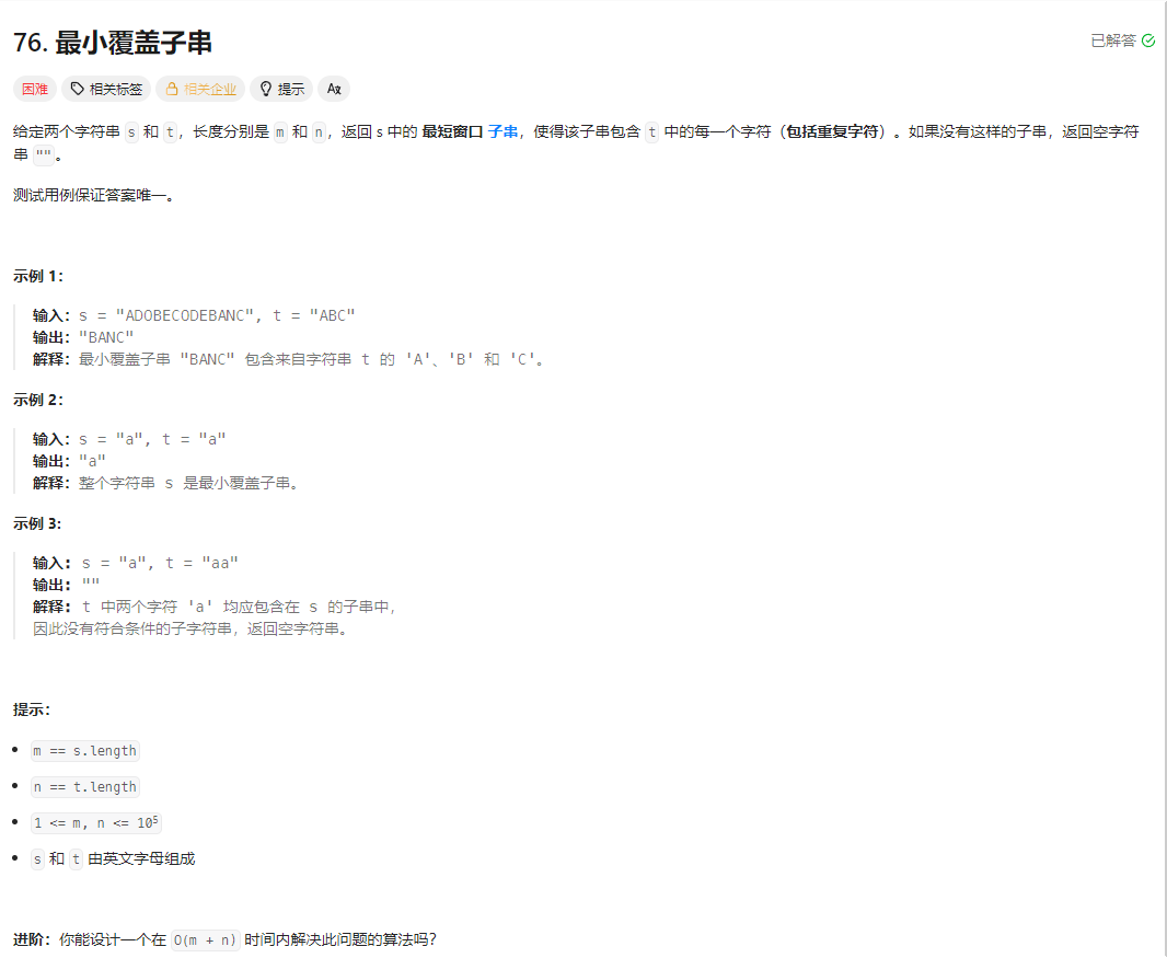 该解法是最小覆盖子串的最优解,通过滑动窗口的「右扩满足、左缩优化」逻辑,在线性时间内找到最小子串。