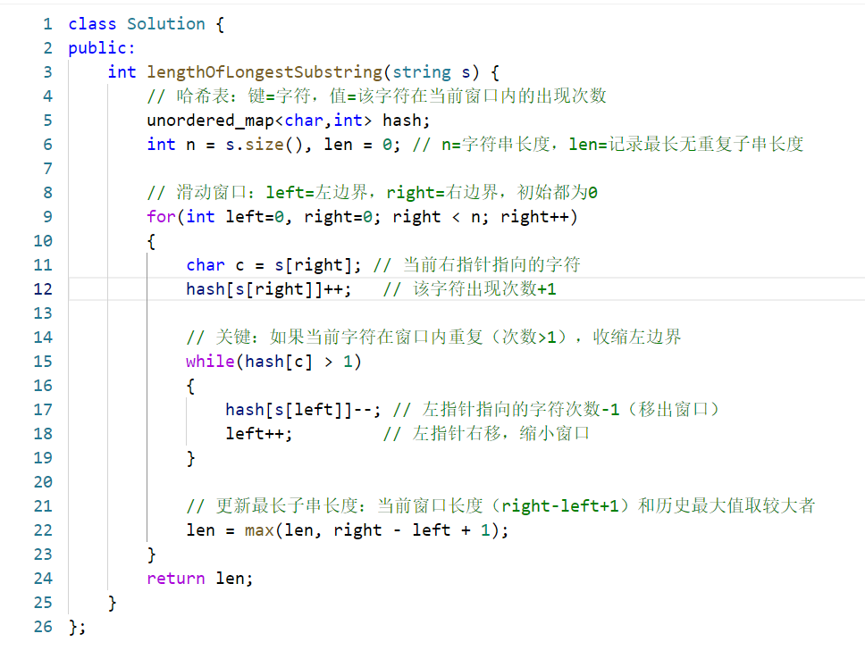 - 左指针收缩时:左指针指向的字符次数 - 1(移出窗口);保证哈希表始终只记录「当前窗口内」的字符次数。