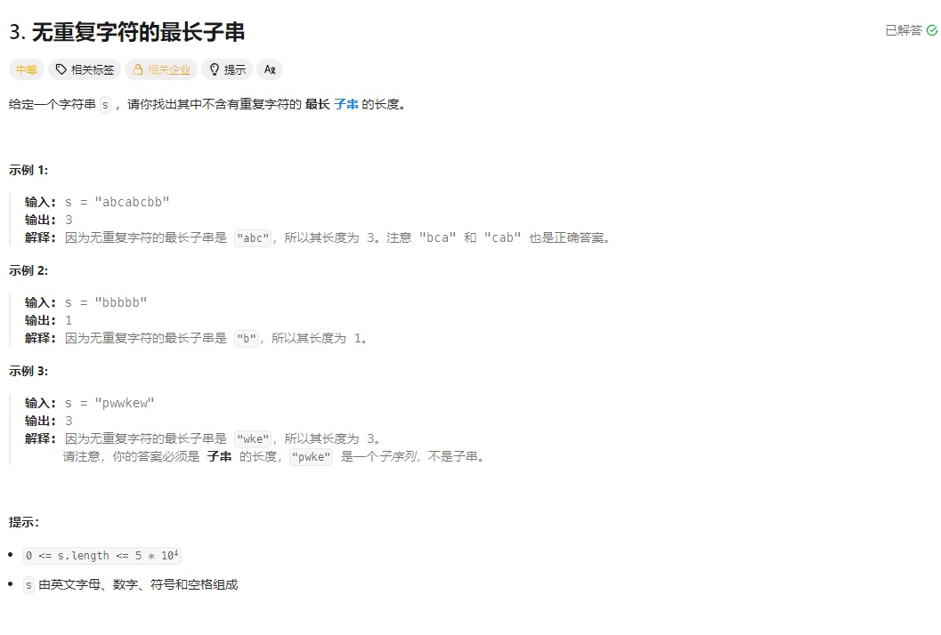给定一个字符串 s,找出其中不含有重复字符的最长子串 的长度(子串是连续的,区别于子序列)。例如:s = "abcabcbb" → 最长无重复子串是 "abc",长度为 3;s = "bbbbb" → 最长长度为 1。