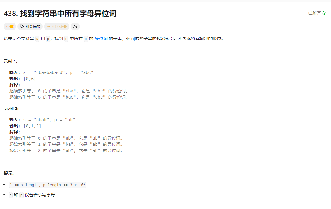 给定两个字符串 s(主串)和 p(模式串),找到 s 中所有 p 的字母异位词 的起始索引(字母异位词指字母相同但排列不同的字符串,例如 "abc" 和 "bca")。例如:s = "cbaebabacd",p = "abc" → 结果为 [0,6](s [0:2]="cba"、s [6:8]="bac" 都是 p 的异位词)。