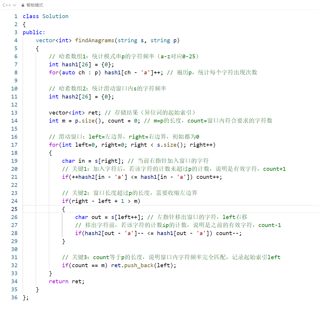 right指针:右移扩展窗口,将当前字符加入计数;left指针:当窗口长度超过 p 的长度时,左移收缩窗口,移出左侧字符的计数;count变量:记录「窗口内符合 p 字符频率要求的字符数量」,当count == p.size()时,说明窗口内是 p 的异位词。