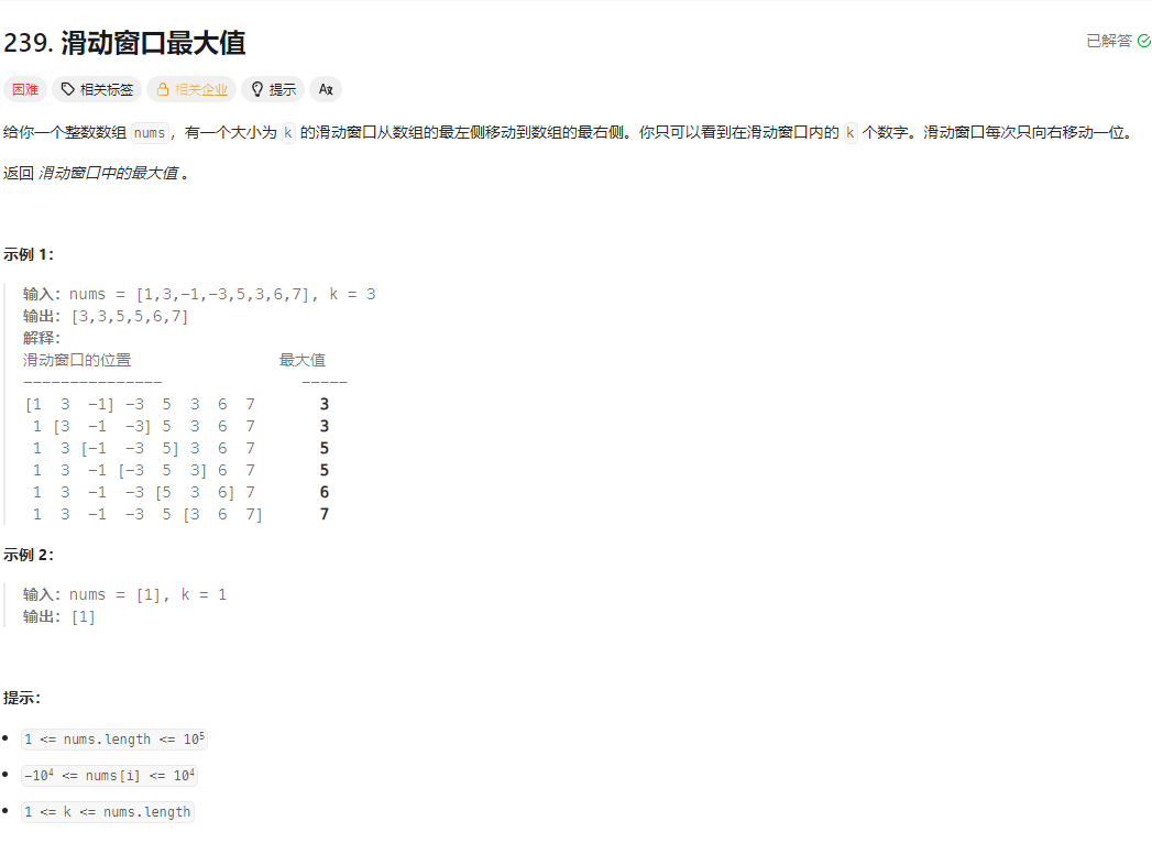 滑动窗口最大值问题的核心挑战是:在 O (n) 的时间复杂度内,高效找到每个滑动窗口的最大值(暴力解法 O (nk) 会超时,因为 n 可达 10⁵)。