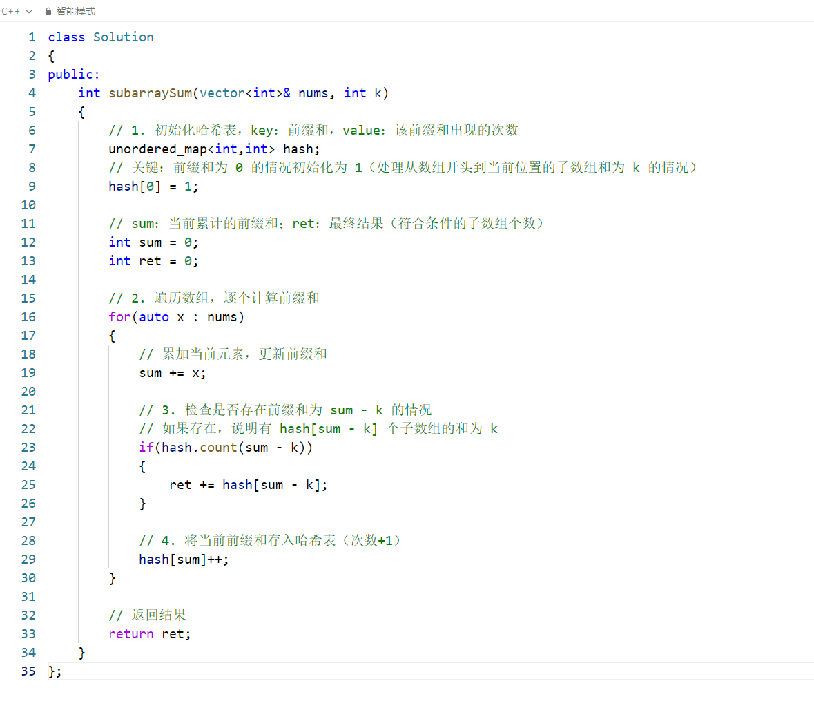 该解法通过「前缀和 + 哈希表」将暴力解法(O (n²))优化为 O (n),核心是利用哈希表记录前缀和的出现次数,快速匹配满足 sum[j] = sum[i] -k 的前缀和,从而统计符合条件的子数组个数。