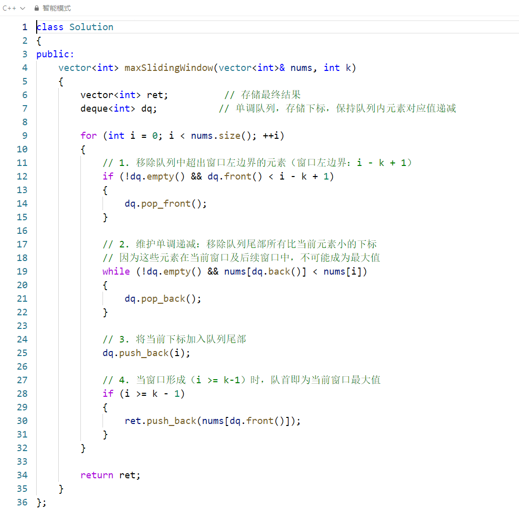 - 维护单调递减的核心逻辑:新元素入队时,移除所有比它小的队尾元素,确保队首始终是窗口最大值;
