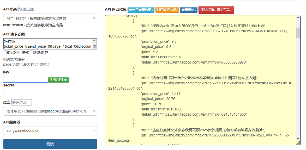 | keyword | 原始关键词 + 淘宝分词优化(如 "无线耳机" 拆分为 "无线 + 耳机") | 检索核心依据 | 关键词含敏感词直接返回空结果 |