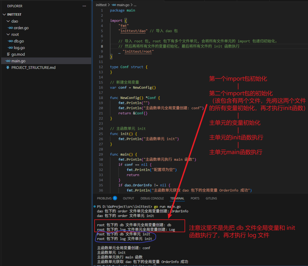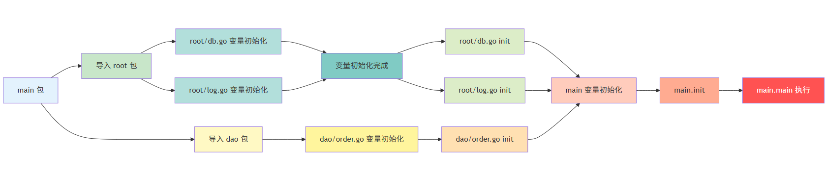 _ "inittest/root" // 导入 root 包, root 包下有多个文件单元, 会将所有文件单元的 import 包递归初始化,然后再将所有文件的变量初始化,最后将所有文件的 init 函数执行