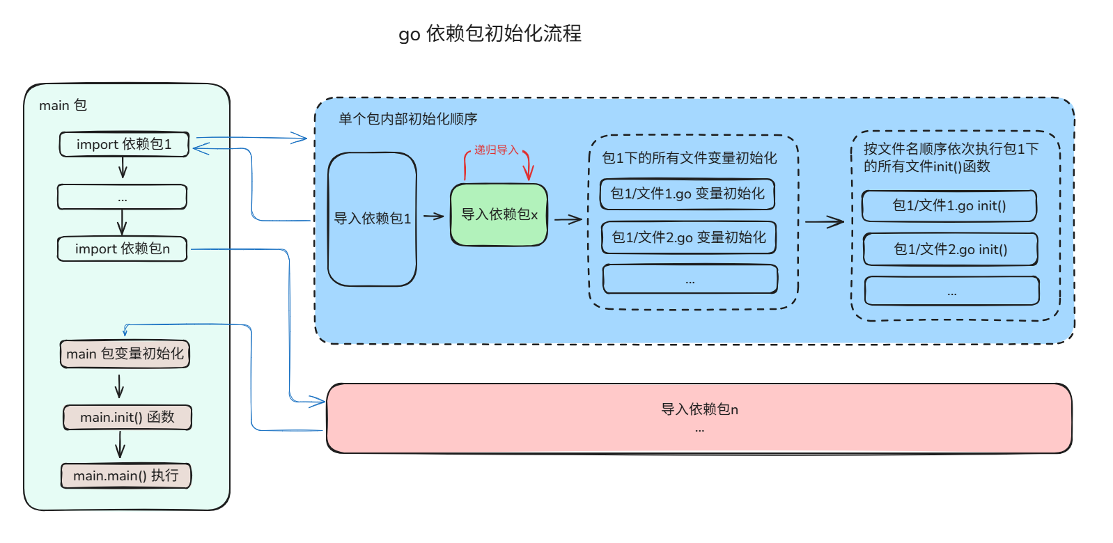 1、当存在 import 包,会递归先初始化依赖包,依此再初始化第二个 import 包