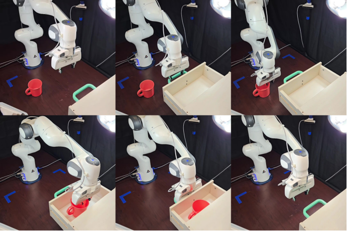 任务流程 :Franka 机械臂需要依次完成:(1) 打开抽屉;(2) 抓取桌面上随机位置的马克杯;(3) 将马克杯放入抽屉;(4) 关闭抽屉。
