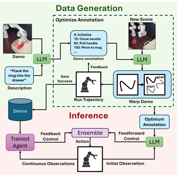 LLM Trainer 的出现旨在解决这一痛点。它通过利用LLM 的语义理解能力,自动识别演示中的关键帧(Keyframes)和物体关系,并将这些关键帧适配到新场景中,从而通过"数据增强"的方式,从单条演示裂变出成百上千条训练数据。