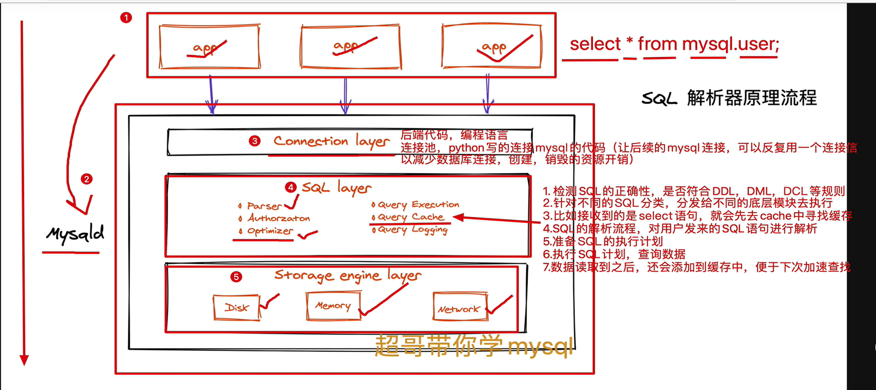 如图所示,所有的app是一个应用程序,可以有非常多不同的应用程序,像手机里面不同的APP程序一样,假设我们在应用程序上进行了商品查询的动作,就是select的语句,应用程序会将查询的动作通过mysqld连接到后端的代码【可以是Python、go Java语言,看后端是使用的什么语言构建的】,这个是连接层,会进入连接池,【如果在这个连接池之前有过连接数据就可以直接复制,没有连接过会将数据同步到连接池里面记录,以方便下次的连接,这样是为了减少数据库的连接,节约资源,最消耗资源的不是进行操作,而是连接和断开的时候】 连接层会将申请的SQL语句传递到sql layer,在这里1、会进行检查sql语句是否正确,是否符合规则;2、会针对不同的sql进行分类,发放给不同的模块进行执行,例如这里是查询语句就会先去cache缓存中查询,有就进行响应,没有的会进行sql的解析;3、会由parser进行sql的解析,对用户的sql进行解析是需要查看哪些表的哪些字段数据;4、authorzatom会进行权限的判断,检查是否有对应的权限进行使用,没有就会报错;5、准备sql的执行计划;6、执行sql计划进行查询数据,在对应的模块进行读取数据,内存 磁盘等;7、读取之后的数据会添加到缓存中,方便下一次的查询。