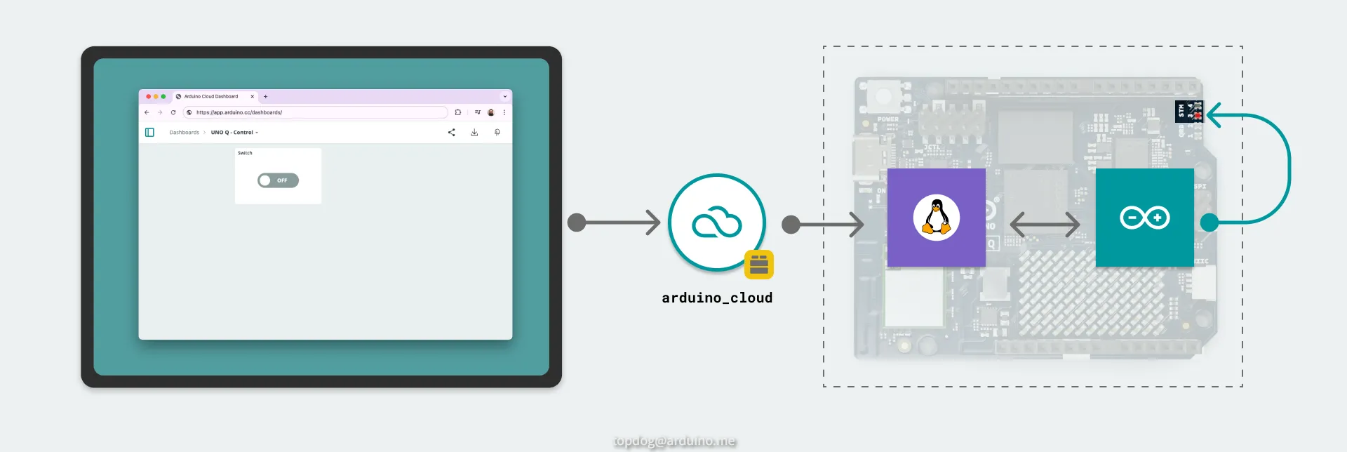 运行在 UNO Q 板载 Linux 环境中的 Python 会启动云端连接,并对变量进行监听。当它检测到变量值的改变,会执行一个回调函数,并在回调内发起 Bridge 调用。