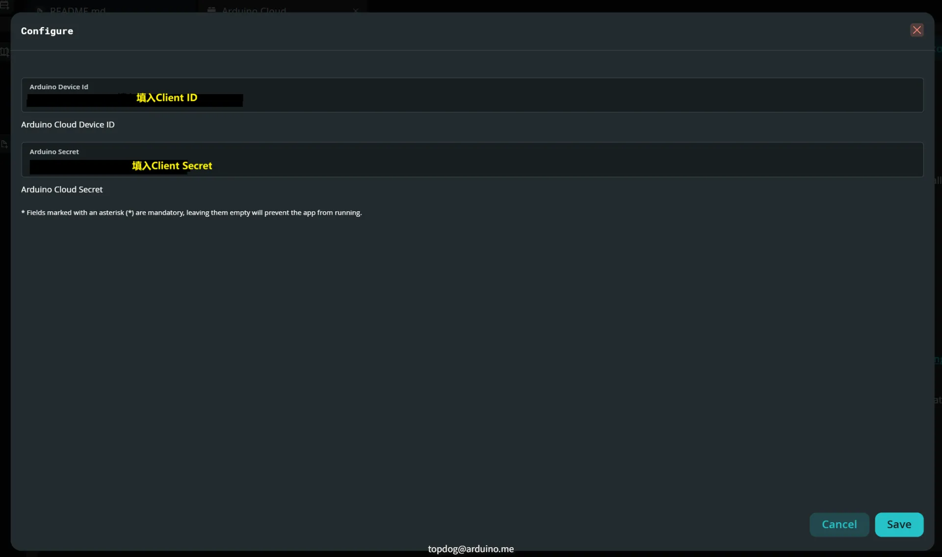 3,在配置中填入云端凭证:用您刚才记录的 device_id 和 secret_key,替换样例中的占位符文本(<YOUR_DEVICE_ID> 与 <YOUR_SECRET>),确认保存。此时您的应用才能与云端建立加密连接与通道。这步非常关键文档中也没有提及,两个参数自动写入app.yaml文件,请大家记住Client Secret上必须带有"xxxx"。