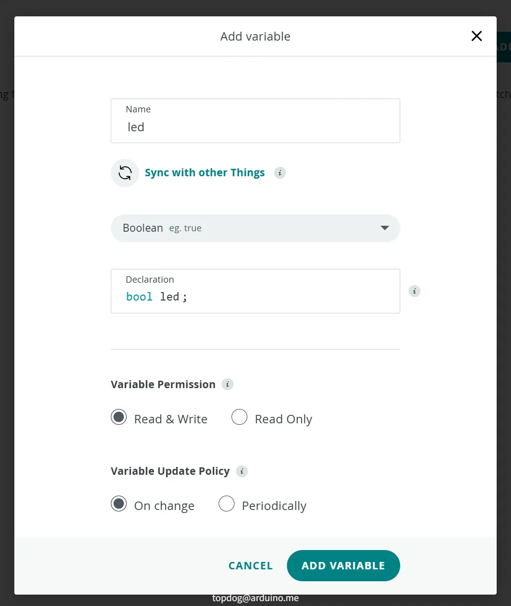 3,进入 Things,创建一个新 Thing。在 Thing 内部创建一个 boolean 类型变量,命名为"led",