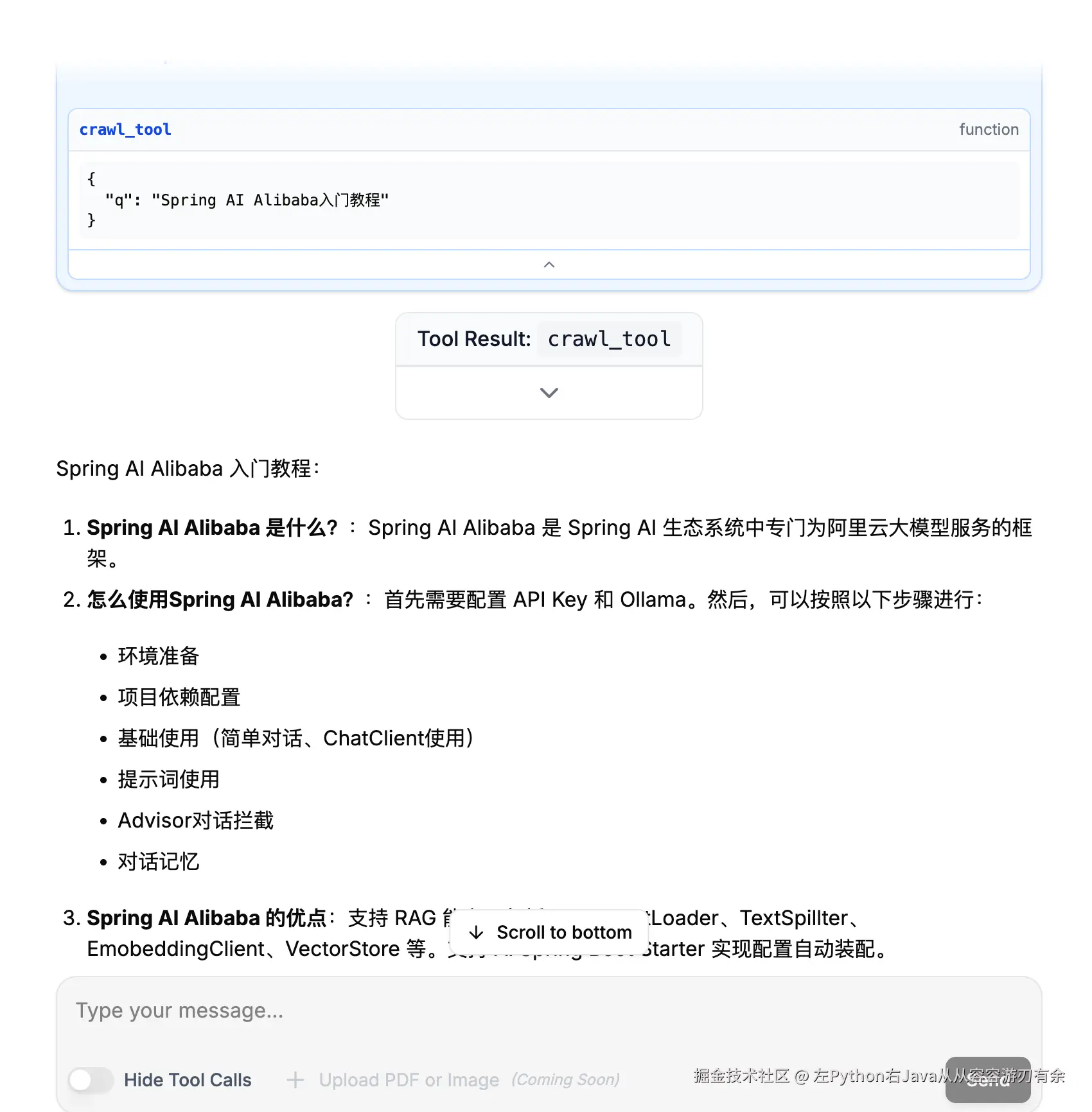 输入:Spring AI Alibaba 入门教程 ,ReactAgent 会判断,调用crawl_tool 查询信息