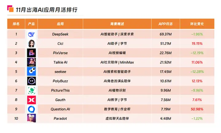《DeepSeek》 尽管有略微回调,但仍以6900万月活继续领跑;而《Cici》则取得19%的月活增长,成为本月表现最亮眼的出海玩家。相较之下,《Seekee》、《PixVerse》等应用出现较大幅度下滑,原因可能受到与中腰部工具类应用竞争加剧、渠道成本上升等因素影响。