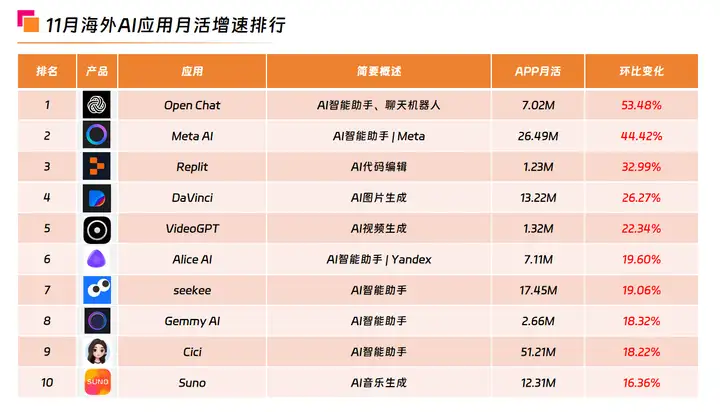 11月月活增速前10名的 AI 应用仍由通用型 AI 助手领跑 。《Open Chat》与《Meta AI》分别实现53%和44%的高速增长,带动整体赛道保持强劲势头。
