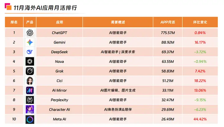 11月海外 AI 应用月活排行中,头部应用仍保持较高的用户黏性和留存,并以由通用型 AI 助手占据主导位置。其中,《ChatGPT》以7.7亿月活稳坐第一梯队 ,基本盘稳固;而《Gemini》、《Grok》、《Cici》、《Meta AI》等应用环比均实现显著增长。