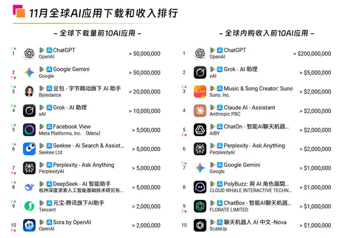 具体应用来看,《ChatGPT》依旧稳坐全球 AI 应用下载量和收入排行榜首 。而同样是 OpenAI 旗下,在前几个月爆火的视频生成应用《Sora》在11月份却偃旗息鼓,下载量锐减排名跌至第10位。此外,《豆包》 、《Grok》 、**《Seekee》**等排名则有所上升。整体来看,聊天助手在前10中仍占主导地位。