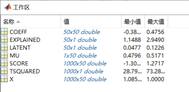 COEFF, SCORE\] = pca(X) returns the principal component score, which is the representation of X in the principal component space. Rows of SCORE correspond to observations, columns to components. The centered data can be reconstructed by SCORE\*COEFF'. \[COEFF, SCORE, LATENT\] = pca(X) returns the principal component variances, i.e., the eigenvalues of the covariance matrix of X, in LATENT. \[COEFF, SCORE, LATENT, TSQUARED\] = pca(X) returns Hotelling's T-squared statistic for each observation in X. pca uses all principal components to compute the TSQUARED (computes in the full space) even when fewer components are requested (see the 'NumComponents' option below). For TSQUARED in the reduced space, use MAHAL(SCORE,SCORE). \[COEFF, SCORE, LATENT, TSQUARED, EXPLAINED\] = pca(X) returns a vector containing the percentage of the total variance explained by each principal component. \[COEFF, SCORE, LATENT, TSQUARED, EXPLAINED, MU\] = pca(X) returns the estimated mean. \[...\] = pca(..., 'PARAM1',val1, 'PARAM2',val2, ...) specifies optional parameter name/value pairs to control the computation and handling of special data types. Parameters are: 'Algorithm' - Algorithm that pca uses to perform the principal component analysis. Choices are: 'svd' - Singular Value Decomposition of X (the default). 'eig' - Eigenvalue Decomposition of the covariance matrix. It is faster than SVD when N is greater than P, but less accurate because the condition number of the covariance is the square of the condition number of X. 'als' - Alternating Least Squares (ALS) algorithm which finds the best rank-K approximation by factoring a X into a N-by-K left factor matrix and a P-by-K right factor matrix, where K is the number of principal components. The factorization uses an iterative method starting with random initial values. ALS algorithm is designed to better handle missing values. It deals with missing values without listwise deletion (see {'Rows', 'complete'}). 'Centered' - Indicator for centering the columns of X. Choices are: true - The default. pca centers X by subtracting off column means before computing SVD or EIG. If X contains NaN missing values, NANMEAN is used to find the mean with any data available. false - pca does not center the data. In this case, the original data X can be reconstructed by X = SCORE\*COEFF'. 'Economy' - Indicator for economy size output, when D the degrees of freedom is smaller than P. D, is equal to M-1, if data is centered and M otherwise. M is the number of rows without any NaNs if you use 'Rows', 'complete'; or the number of rows without any NaNs in the column pair that has the maximum number of rows without NaNs if you use 'Rows', 'pairwise'. When D \< P, SCORE(:,D+1:P) and LATENT(D+1:P) are necessarily zero, and the columns of COEFF(:,D+1:P) define directions that are orthogonal to X. Choices are: true - This is the default. pca returns only the first D elements of LATENT and the corresponding columns of COEFF and SCORE. This can be significantly faster when P is much larger than D. NOTE: pca always returns economy size outputs if 'als' algorithm is specifed. false - pca returns all elements of LATENT. Columns of COEFF and SCORE corresponding to zero elements in LATENT are zeros. 'NumComponents' - The number of components desired, specified as a scalar integer K satisfying 0 \< K \<= P. When specified, pca returns the first K columns of COEFF and SCORE. 'Rows' - Action to take when the data matrix X contains NaN values. If 'Algorithm' option is set to 'als, this option is ignored as ALS algorithm deals with missing values without removing them. Choices are: 'complete' - The default action. Observations with NaN values are removed before calculation. Rows of NaNs are inserted back into SCORE at the corresponding location. 'pairwise' - If specified, pca switches 'Algorithm' to 'eig'. This option only applies when 'eig' method is used. The (I,J) element of the covariance matrix is computed using rows with no NaN values in columns I or J of X. Please note that the resulting covariance matrix may not be positive definite. In that case, pca terminates with an error message. 'all' - X is expected to have no missing values. All data are used, and execution will be terminated if NaN is found. 'Weights' - Observation weights, a vector of length N containing all positive elements. 'VariableWeights' - Variable weights. Choices are: - a vector of length P containing all positive elements. - the string 'variance'. The variable weights are the inverse of sample variance. If 'Centered' is set true at the same time, the data matrix X is centered and standardized. In this case, pca returns the principal components based on the correlation matrix. The following parameter name/value pairs specify additional options when alternating least squares ('als') algorithm is used. 'Coeff0' - Initial value for COEFF, a P-by-K matrix. The default is a random matrix. 'Score0' - Initial value for SCORE, a N-by-K matrix. The default is a matrix of random values. 'Options' - An options structure as created by the STATSET function. pca uses the following fields: 'Display' - Level of display output. Choices are 'off' (the default), 'final', and 'iter'. 'MaxIter' - Maximum number of steps allowed. The default is 100. Unlike in optimization settings, reaching MaxIter is regarded as convergence. 'TolFun' - Positive number giving the termination tolerance for the cost function. The default is 1e-6. 'TolX' - Positive number giving the convergence threshold for relative change in the elements of L and R. The default is 1e-6. Example: load hald; \[coeff, score, latent, tsquared, explained\] = pca(ingredients); See also ppca, pcacov, pcares, biplot, barttest, canoncorr, factoran, rotatefactors. 我并不关心输入参数,都使用默认设置即可。对于输出参数,可以看到共有六个: \[COEFF, SCORE, LATENT, TSQUARED, EXPLAINED, MU\] = pca(X) 这些输出参数都是什么意思呢?哪个是投影矩阵W?哪