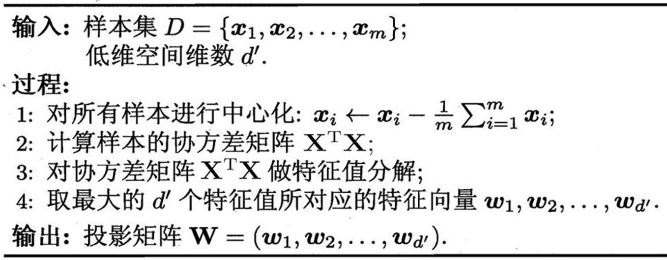其中,m表示样本个数,X表示样本矩阵(大小为m*d,即每行对应一个样本),最后得到投影矩阵W(大小为d*d'),可以将样本从d维降到d'维。