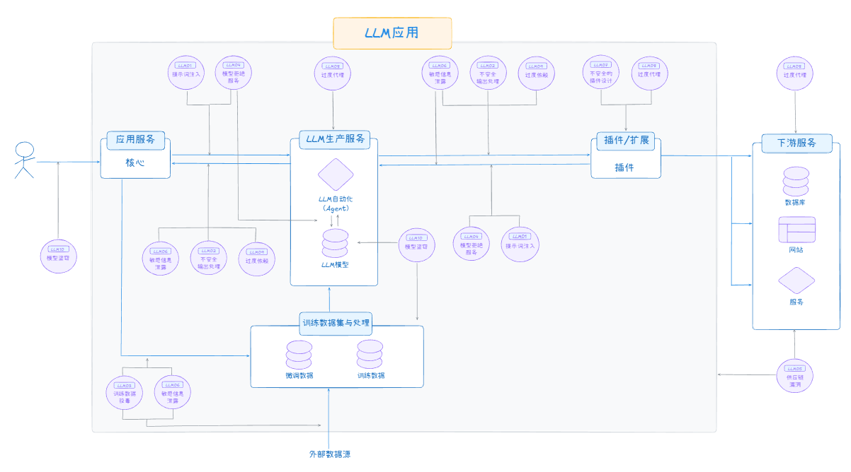 在 OWASP 的架构图中,紫色圆圈标记(LLM01-LLM10)揭示了 LLM 应用在不同生命周期阶段面临的关键安全威胁。我们将这些漏洞按照其在架构中的分布层面进行分类阐述。
